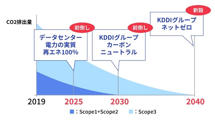 通信事業者は基地局やデータセンターで膨大な電力を消費するため、再生可能エネルギーの調達が最重要課題です。KDDIは「KDDI GREEN PLAN 2030」を掲げ、2030年度までに事業活動に伴うCO2排出量を実質ゼロにすることを目指しています。