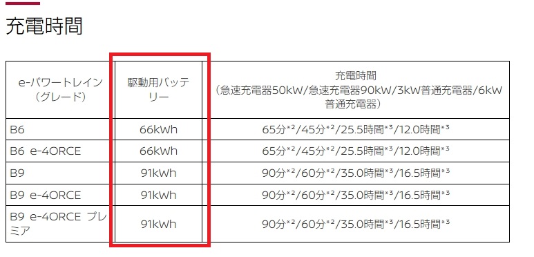 このバッテリー容量が、満充電するために必要な電力量の目安となります。今回は一例として「日産リーフ X」の40kWhを参照します。
