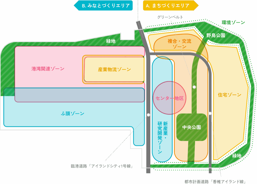 アイランドシティは東側と西側で「まちづくりエリア」と「みなとづくりエリア」という区画を作り、都市機能をわけることで、利便性と快適性に配慮した都市のゾーニングを実現。まちづくりエリアには、2025年9月時点では15,180人・5,418世帯の方が住んでいます。