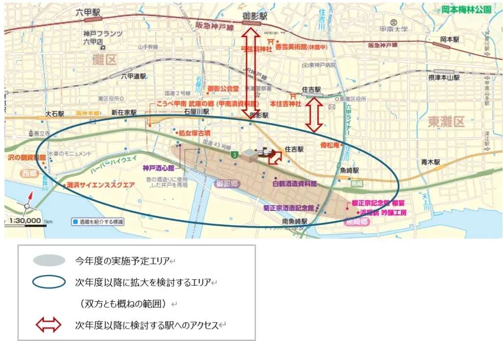 神戸・灘五郷エリアは多くの酒蔵が点在する人気の観光地ですが、各施設間の距離が離れており、徒歩での周遊には限界があるという課題を抱えていました。