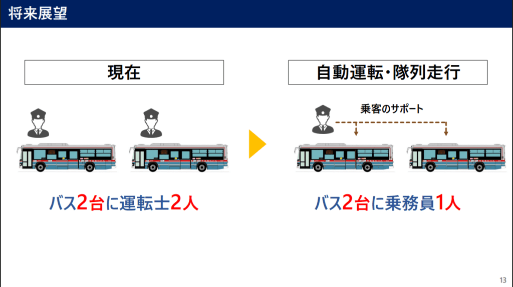 将来的には、自動運転・隊列走行を実現し、「バス2台に運転士2名」という状態から「バス2台に乗務員1名」という状態を実現するように取り組んでいます。